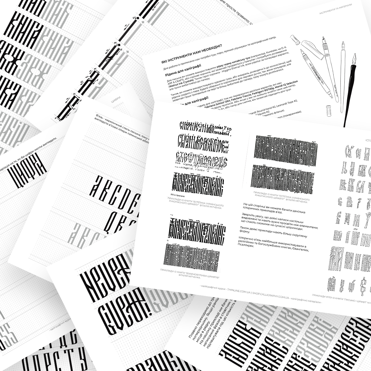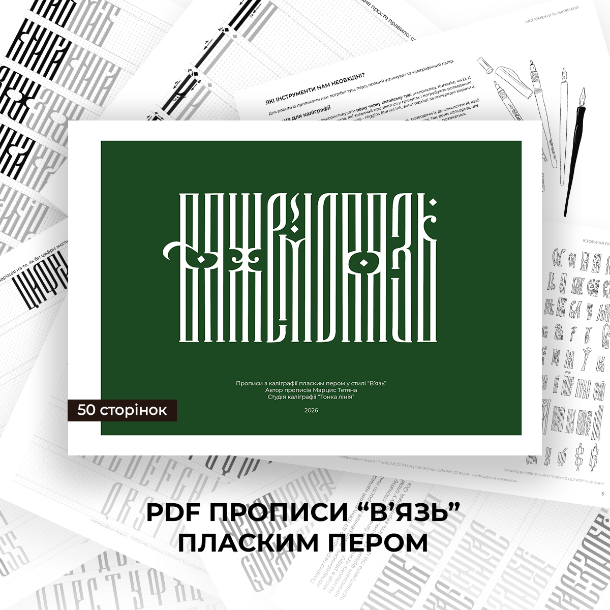 PDF-прописи для самостійного вивчення каліграфії пласким пером у стилі “В’язь”.